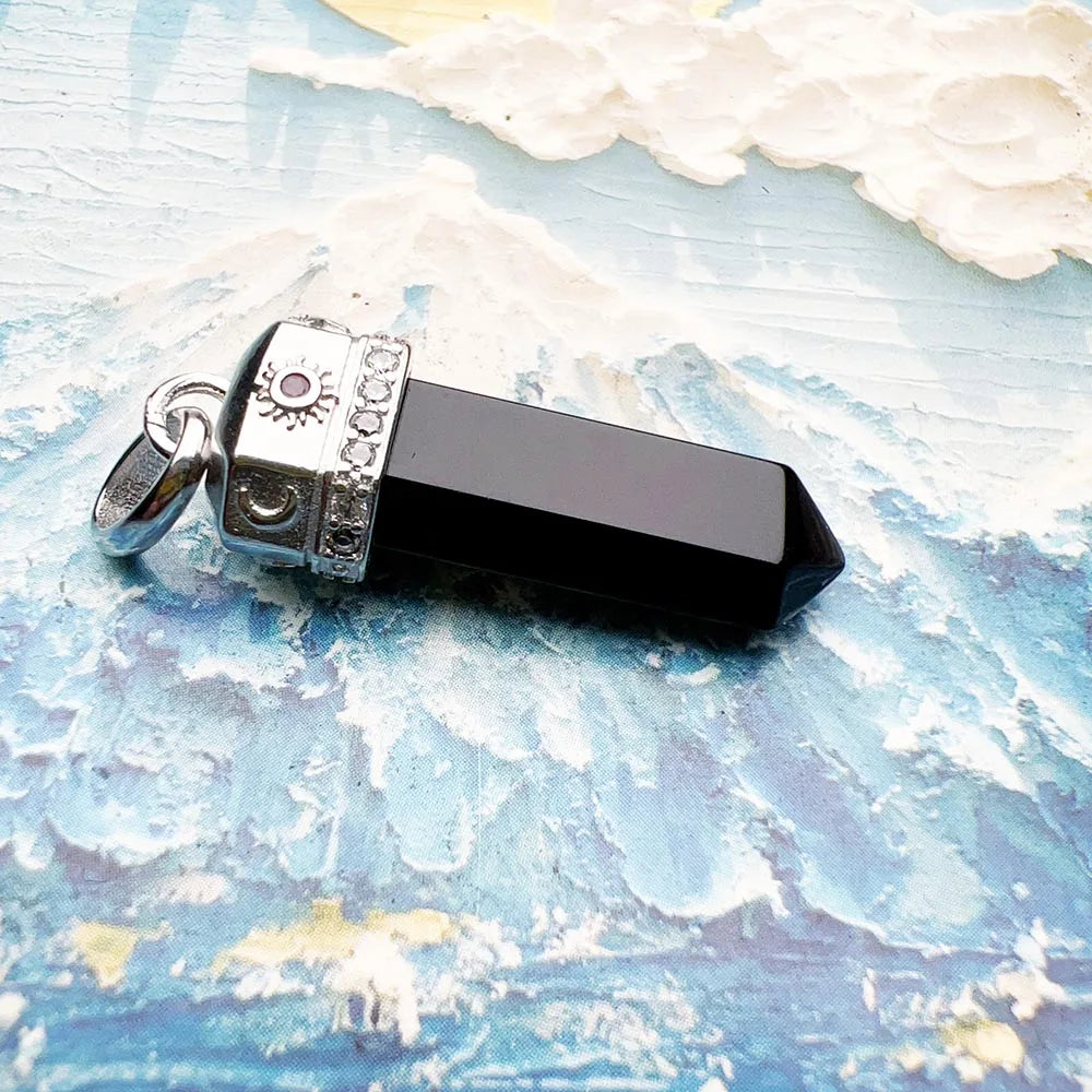 Embrace the balance of light and shadow with this captivating 925 sterling silver pendant, featuring a stunning hexagonal onyx tower. Onyx, known for its protective and grounding properties, is beautifully complemented by tiny sun and moon adornments, symbolizing harmony between the forces of day and night, light and dark. The hexagonal shape represents balance and energy flow, while the red zircon stone sun and moon motifs embody the duality of life and the cycles of nature. This pendant serves as a powerful talisman for those seeking protection, strength, and spiritual alignment with the universe. Featuring a classic closed loop, this pendant is ready to be paired with your favorite chain or cord.
