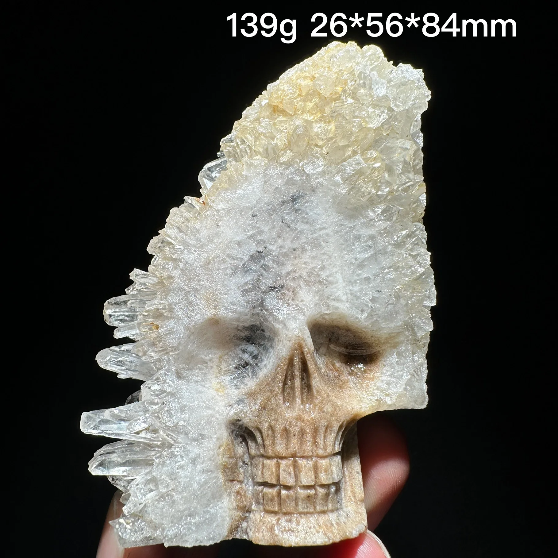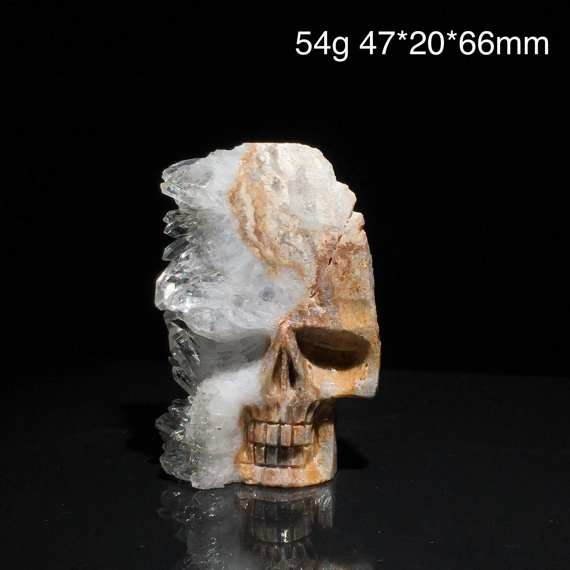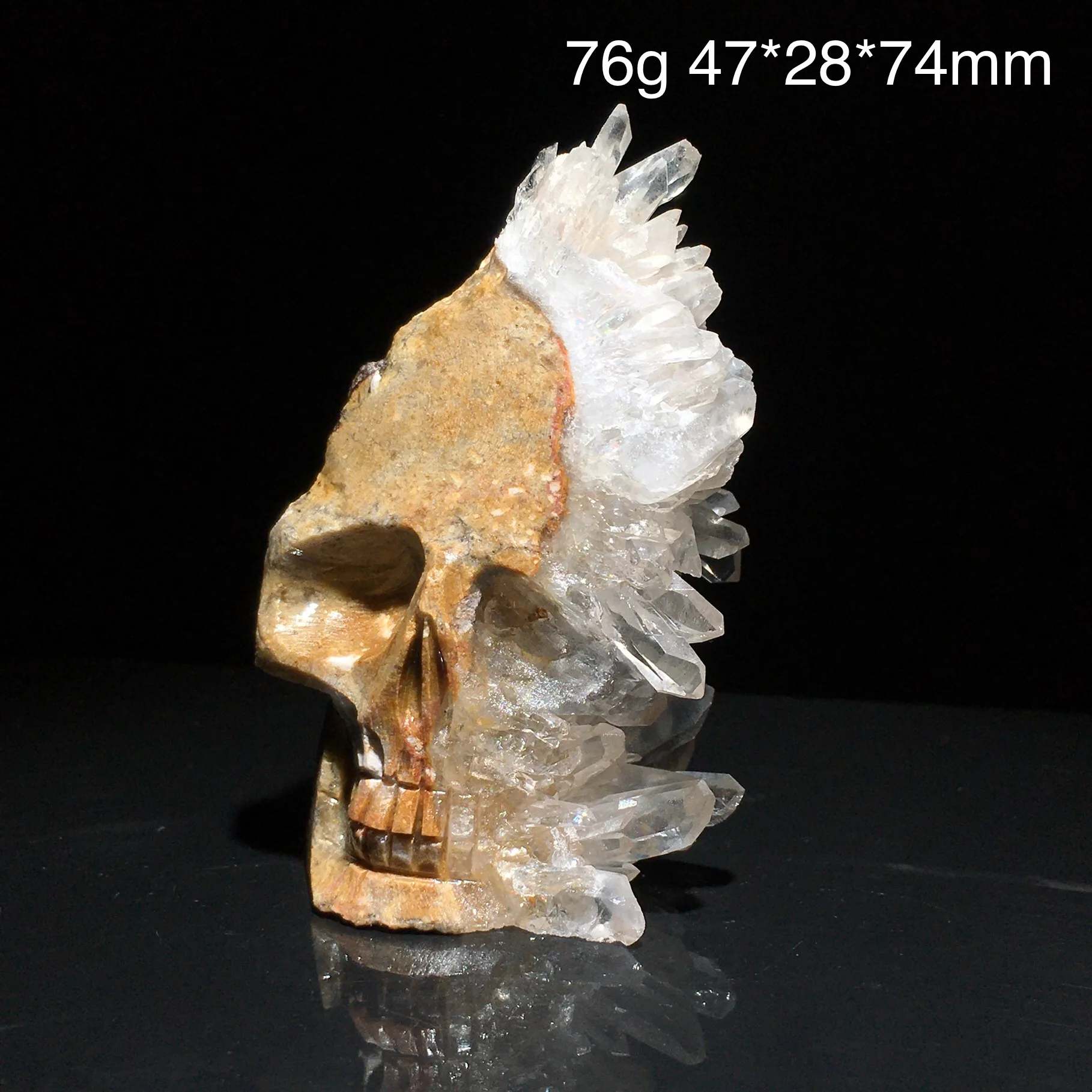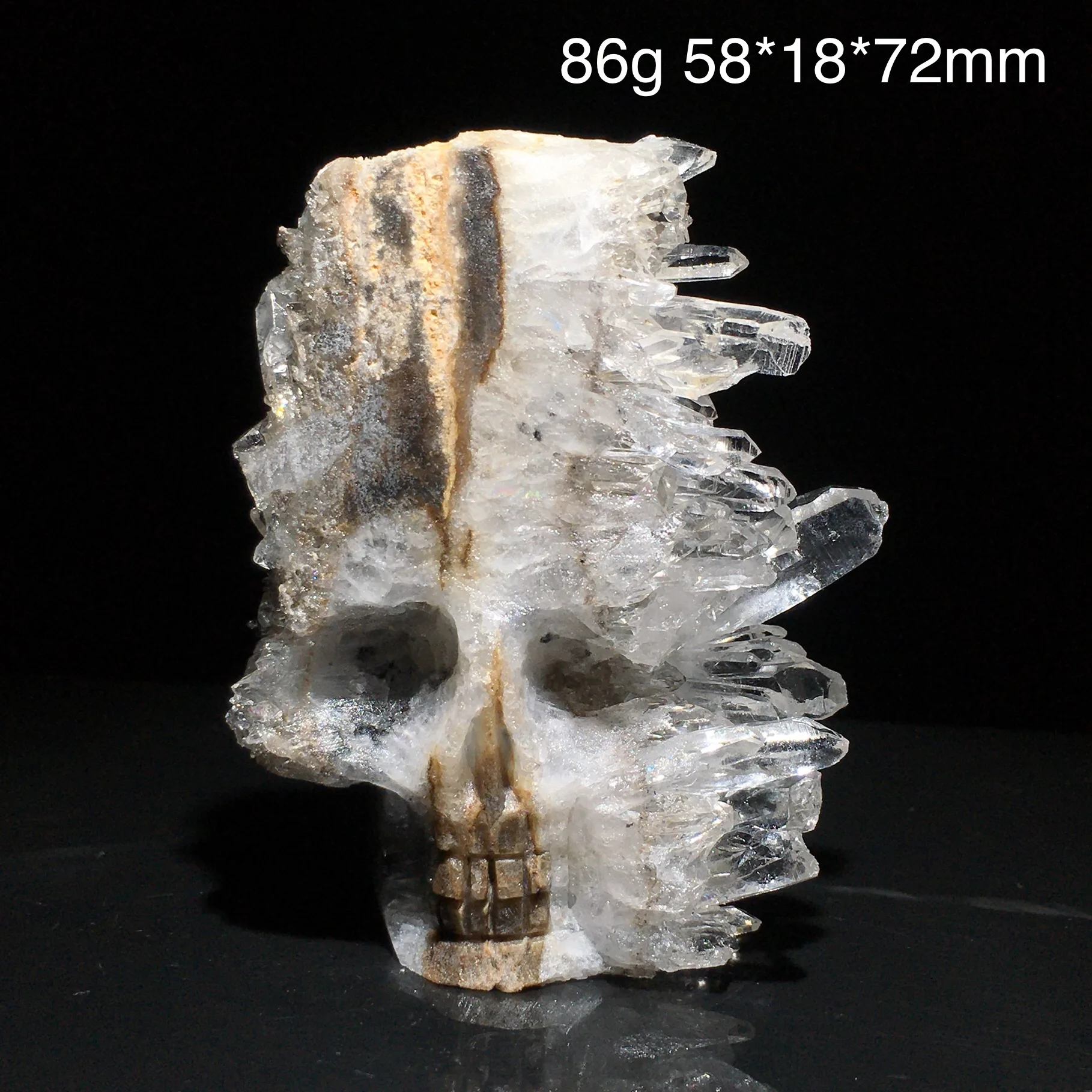 Unite the mystical beauty of clear quartz with bold artistry in this clear quartz cluster half-skull carving. Featuring natural quartz crystal formations seamlessly blended with intricate carving details, this piece symbolizes clarity, transformation, and balance. Perfect for collectors, meditation spaces, or as a unique statement décor, this carving merges the raw energy of quartz with stunning craftsmanship.