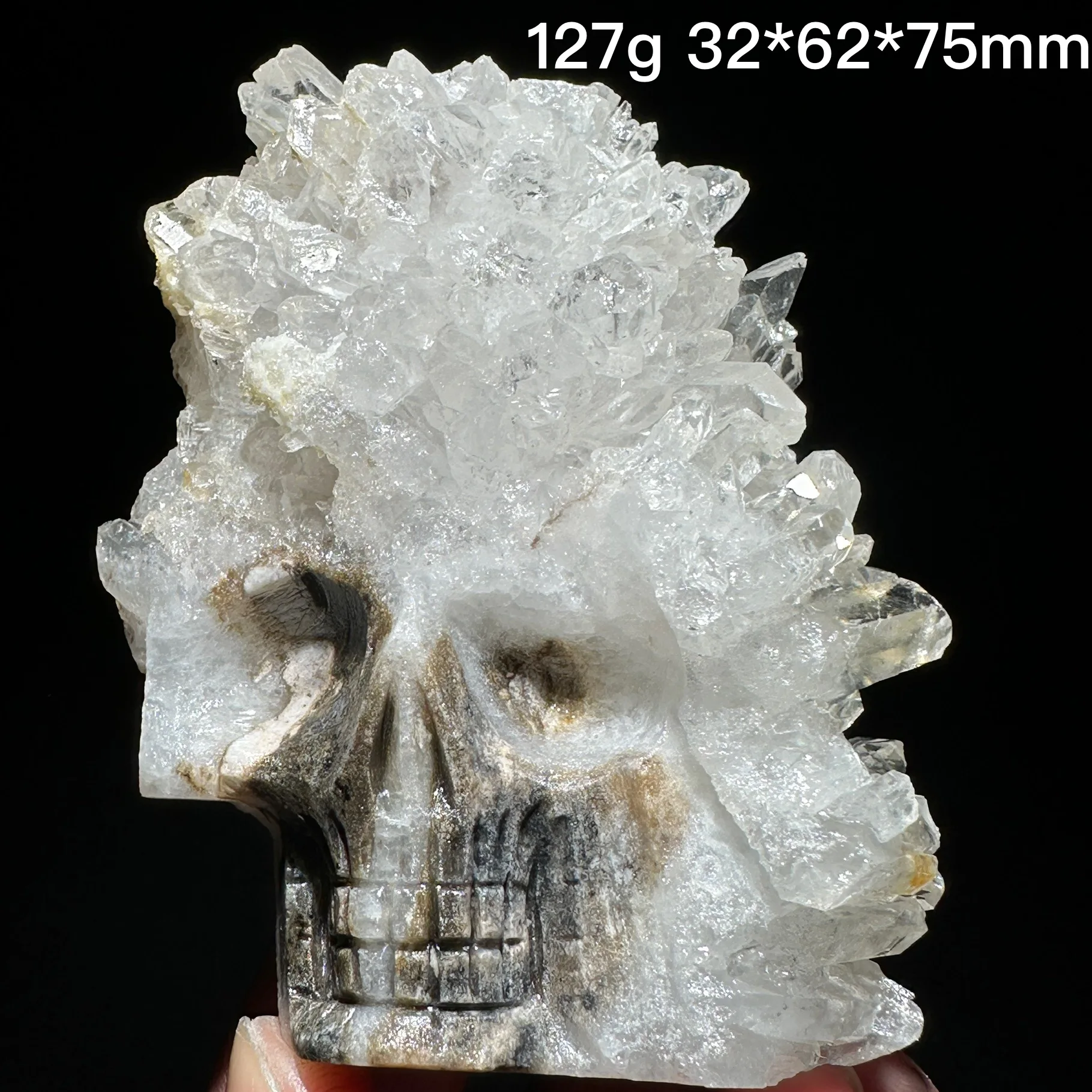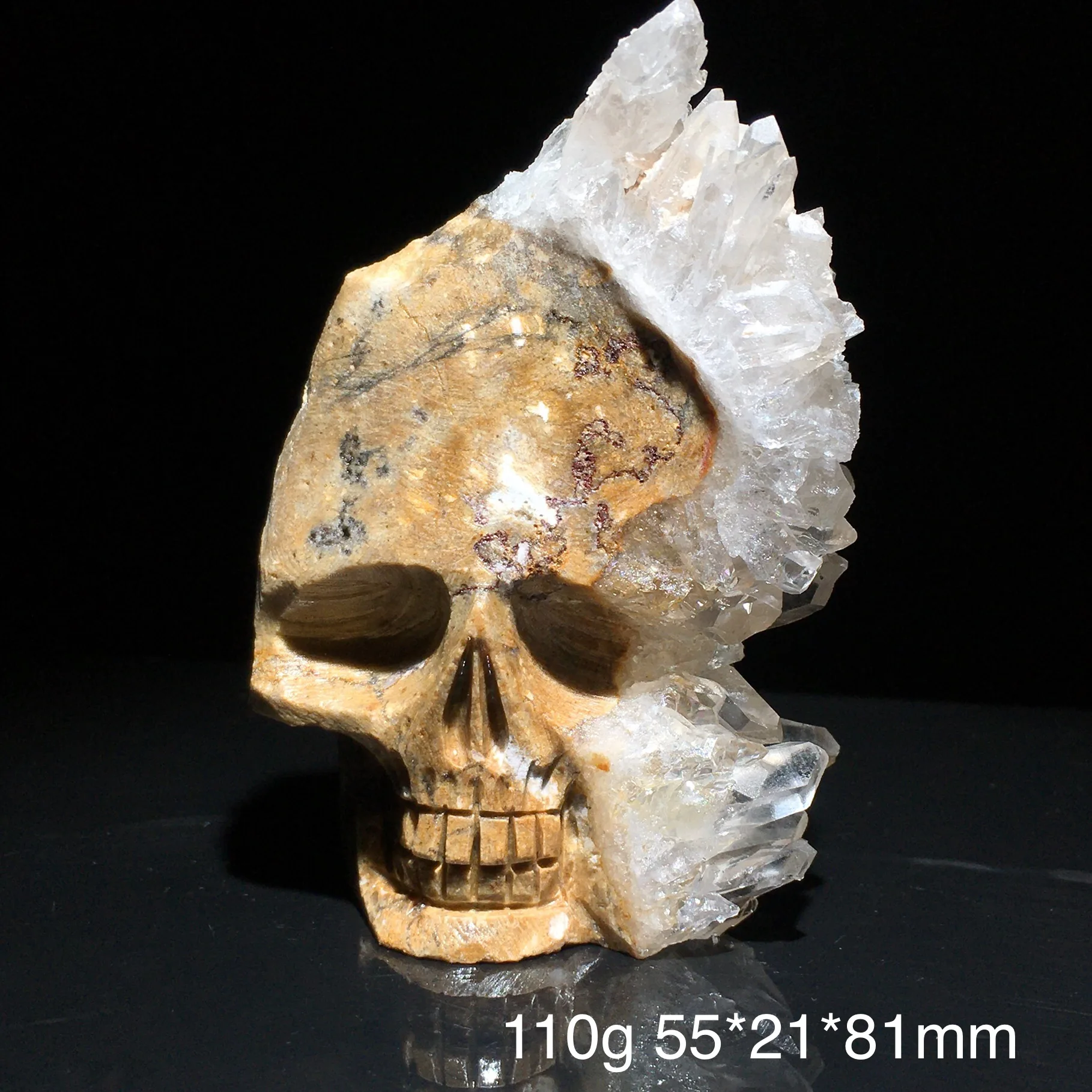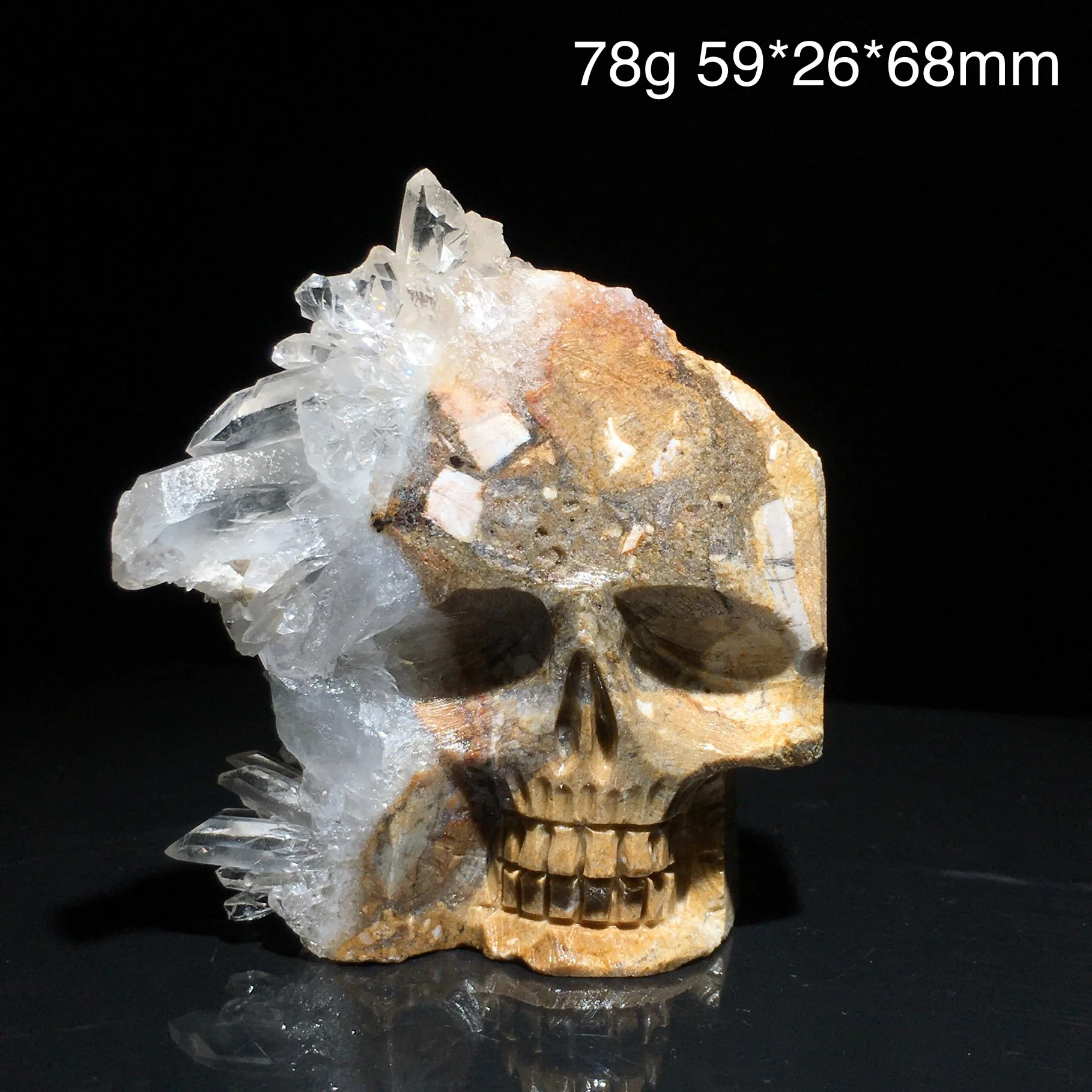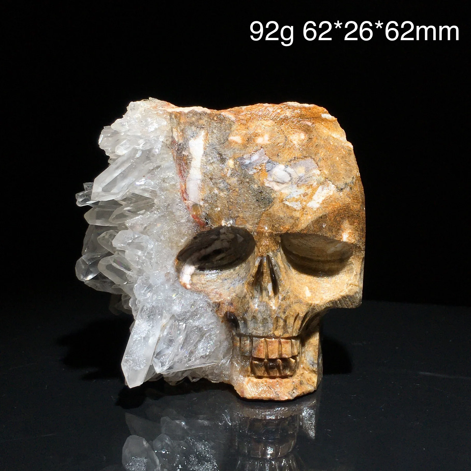 Unite the mystical beauty of clear quartz with bold artistry in this clear quartz cluster half-skull carving. Featuring natural quartz crystal formations seamlessly blended with intricate carving details, this piece symbolizes clarity, transformation, and balance. Perfect for collectors, meditation spaces, or as a unique statement décor, this carving merges the raw energy of quartz with stunning craftsmanship.