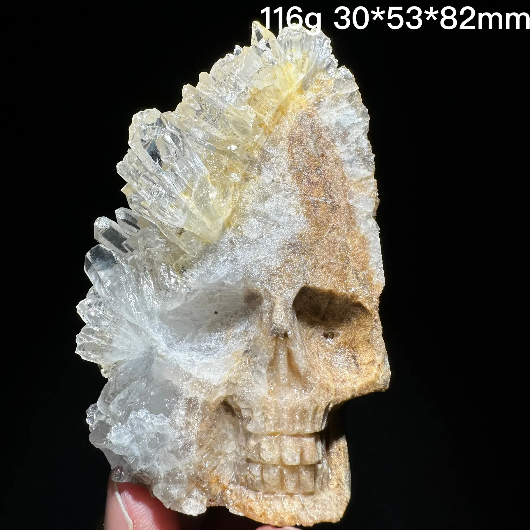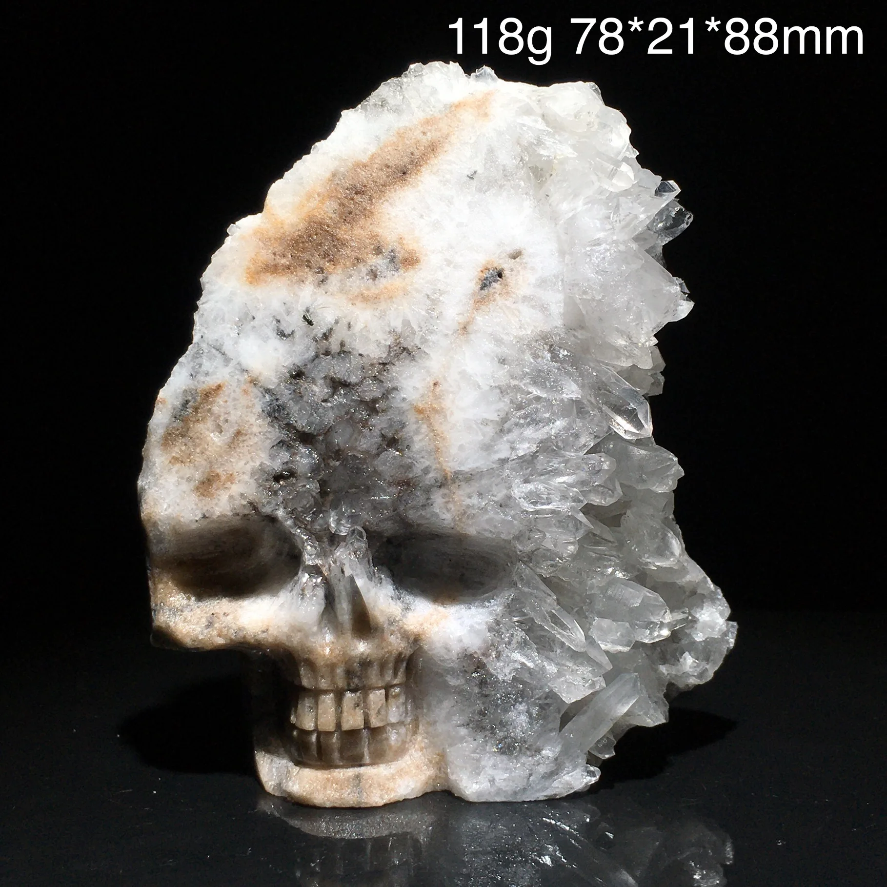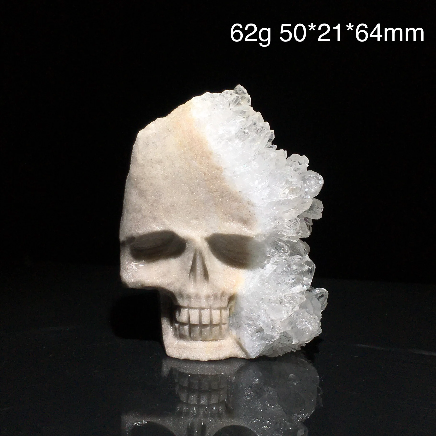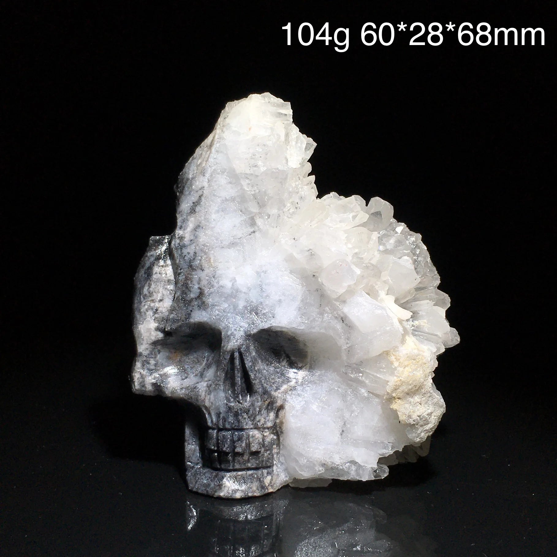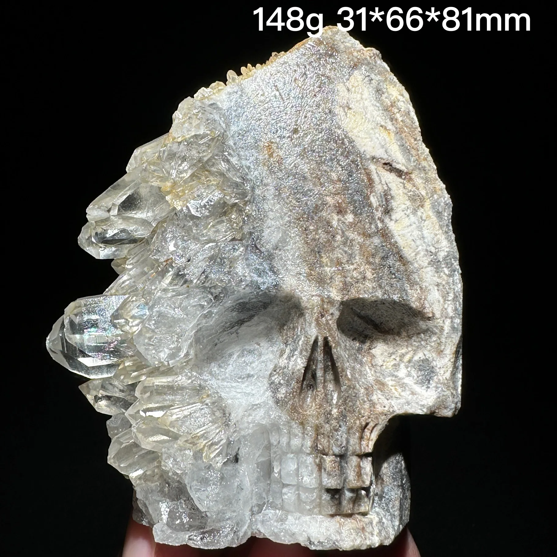 Unite the mystical beauty of clear quartz with bold artistry in this clear quartz cluster half-skull carving. Featuring natural quartz crystal formations seamlessly blended with intricate carving details, this piece symbolizes clarity, transformation, and balance. Perfect for collectors, meditation spaces, or as a unique statement décor, this carving merges the raw energy of quartz with stunning craftsmanship.