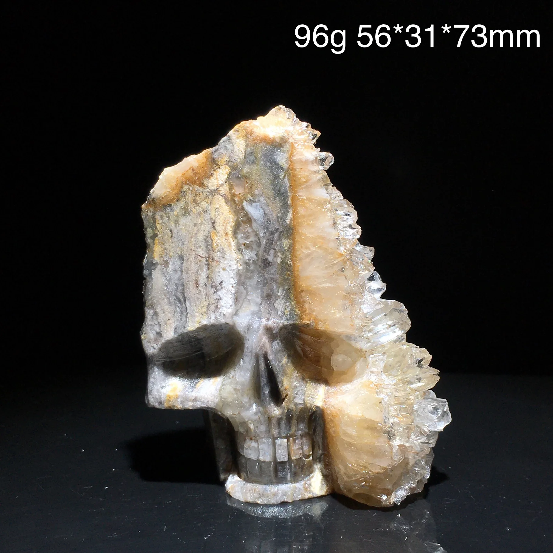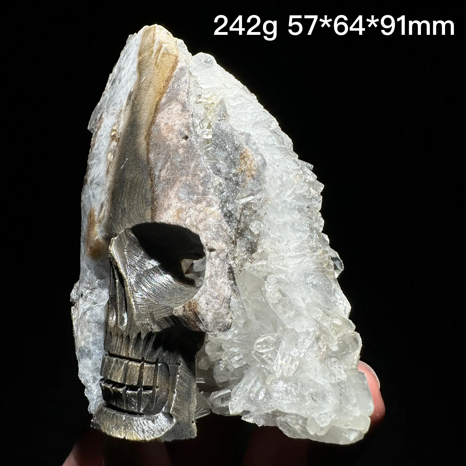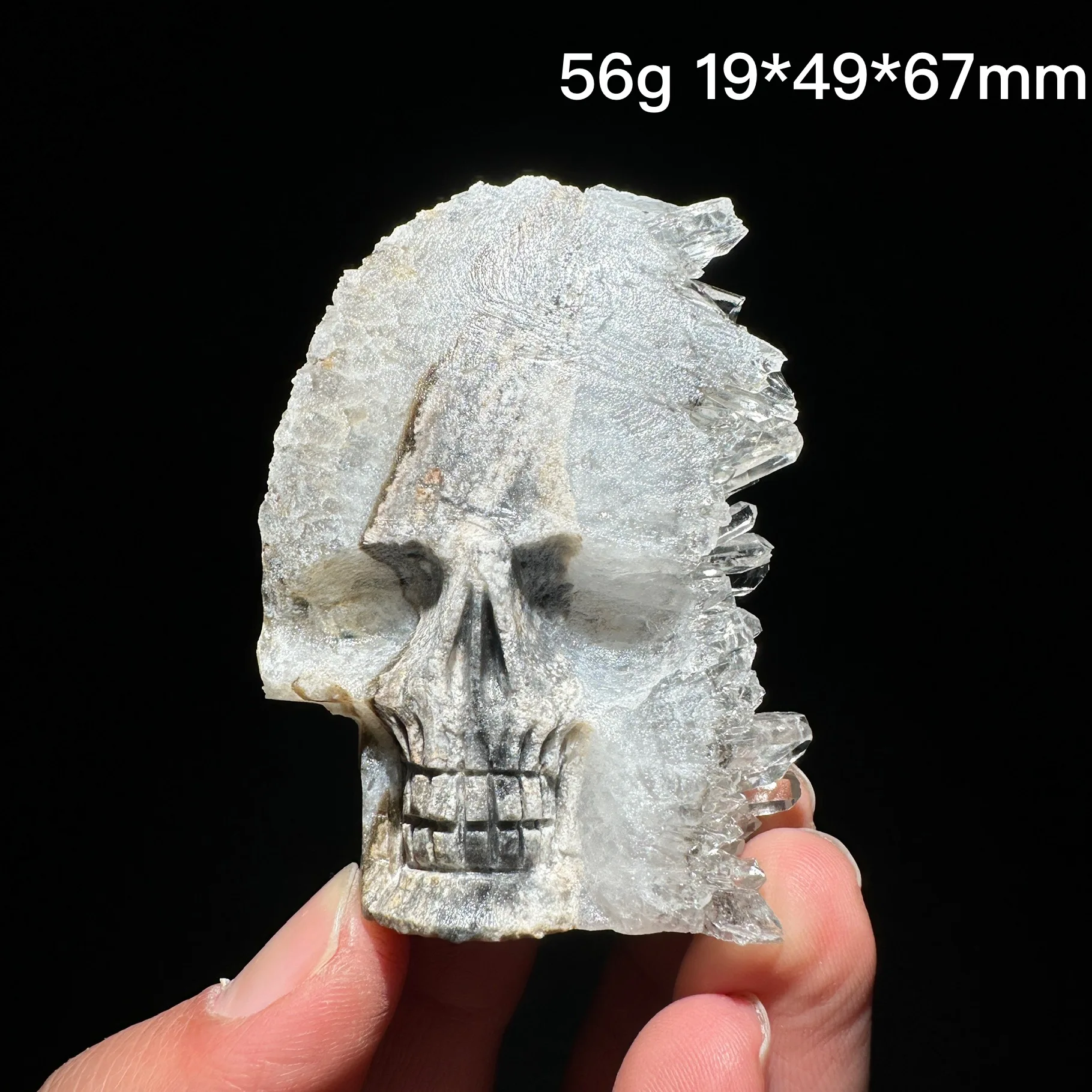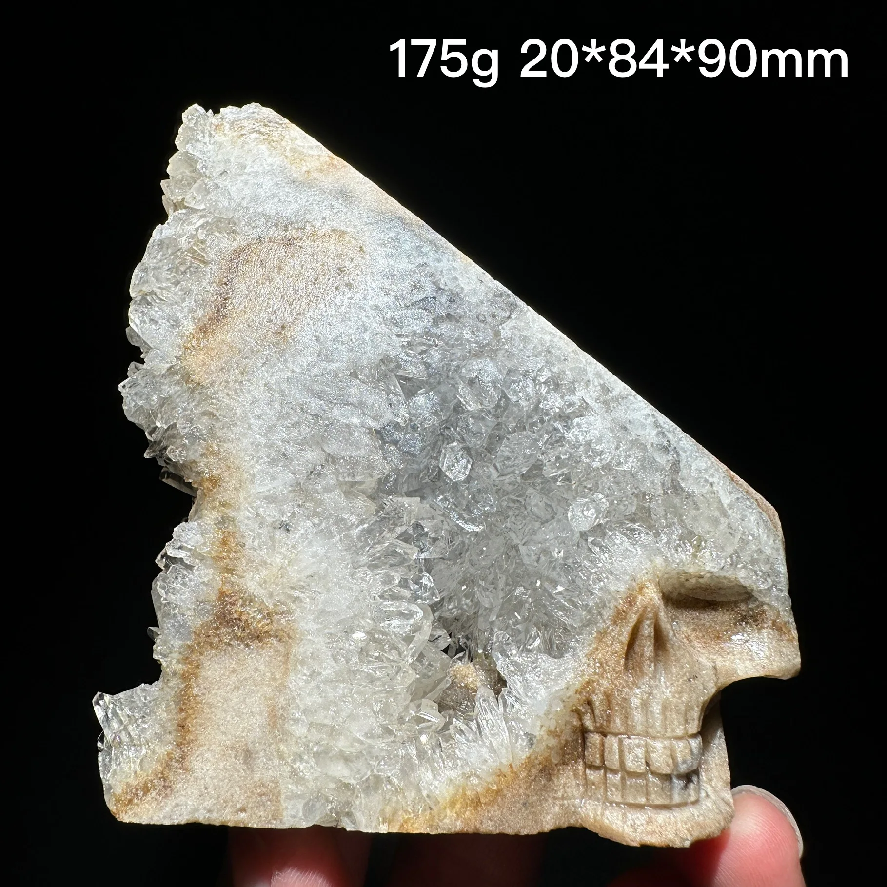 Unite the mystical beauty of clear quartz with bold artistry in this clear quartz cluster half-skull carving. Featuring natural quartz crystal formations seamlessly blended with intricate carving details, this piece symbolizes clarity, transformation, and balance. Perfect for collectors, meditation spaces, or as a unique statement décor, this carving merges the raw energy of quartz with stunning craftsmanship.