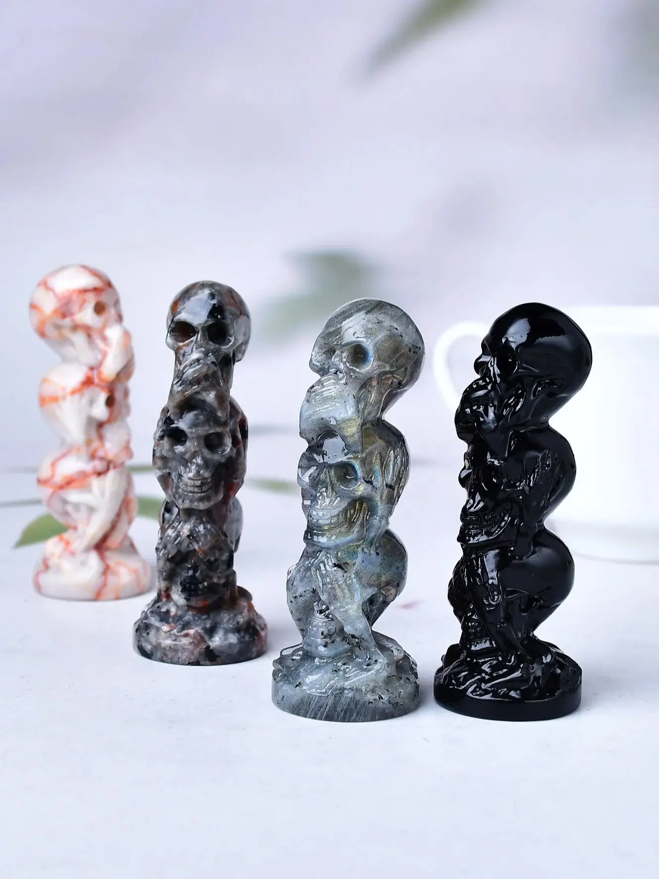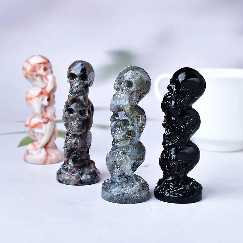 Embrace the timeless wisdom of "See No Evil, Hear No Evil, Speak No Evil" with these stacked crystal skull carvings. Each piece is meticulously crafted from natural crystal, symbolizing clarity, protection, and transformation. The three interconnected skulls serve as a reminder to live with integrity and mindfulness, making this carving a meaningful addition to your collection, altar, or sacred space.