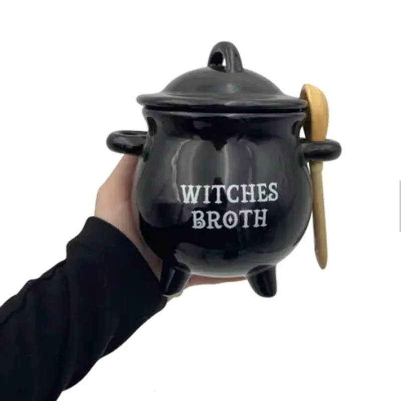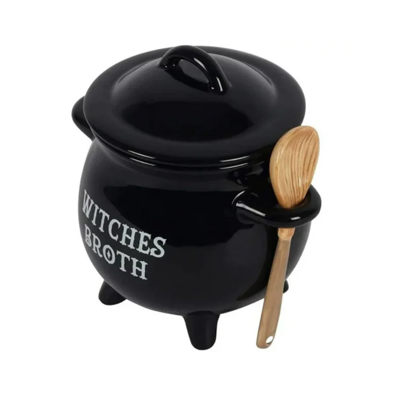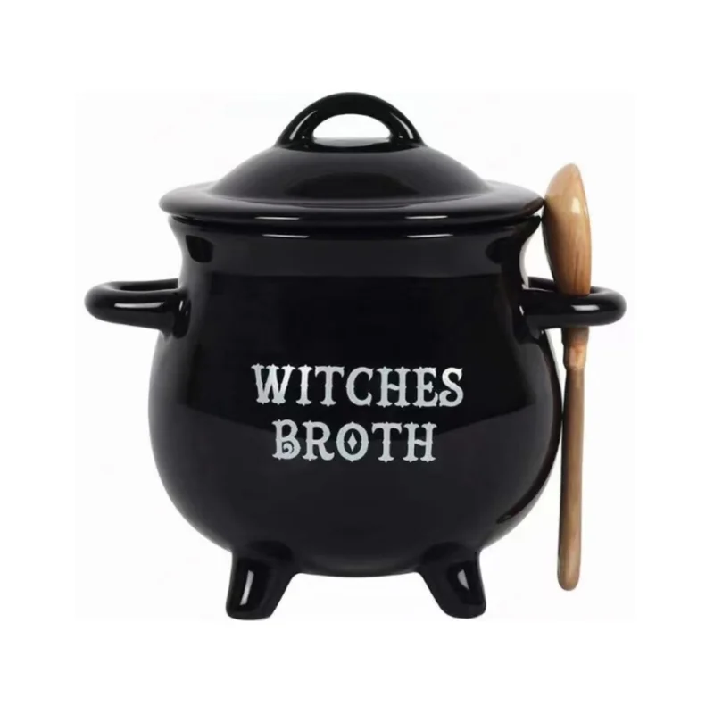 Add a touch of magick to your meals with the Witches Broth Cauldron Soup Bowl, complete with a wooden spoon. Designed to resemble a classic cauldron, this bowl is perfect for single serving soups, stews, or even potions. The sturdy ceramic construction and witchy design make it both functional and enchanting, ideal for cozy meals or adding a mystical vibe to your kitchen. The included wooden spoon adds a rustic touch, making this set perfect for everyday use or special ritual-inspired meals.